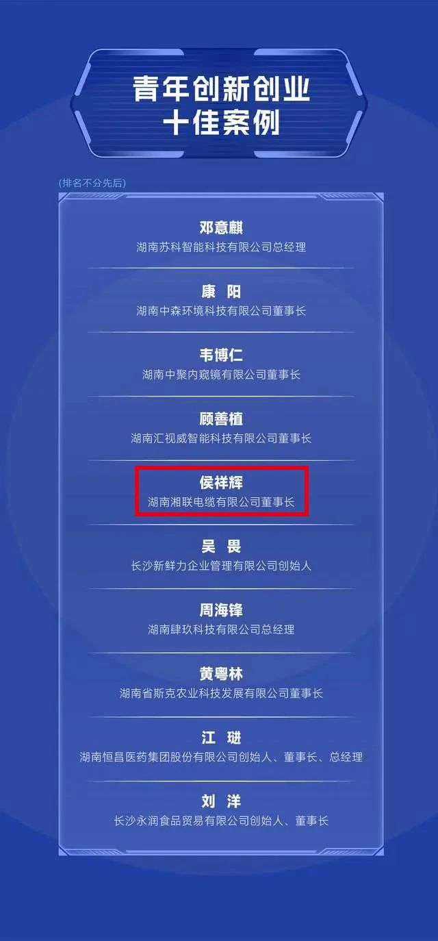 活動(dòng)現(xiàn)場(chǎng),發(fā)布了發(fā)展新質(zhì)生產(chǎn)力十佳案例、青年創(chuàng)新創(chuàng)業(yè)十佳案例、優(yōu)化營商環(huán)境十佳案例3張榜單,湘聯(lián)電纜董事長侯祥輝光榮上榜青年創(chuàng)新創(chuàng)業(yè)十佳案例。
